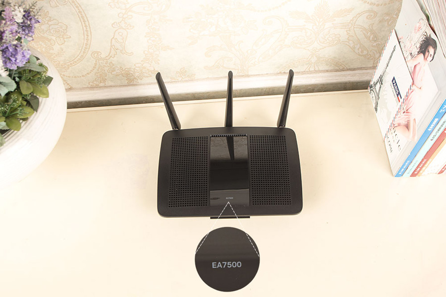 EA7500 V2沿用了第一代產品的經典設計,在外觀并沒有發生變化,頂蓋上覆蓋大面積散熱孔中間玻化處理,LOGO燈相對隱密只有在開機狀態下才會顯示。