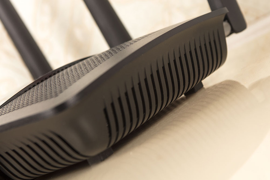 底部依然是大面積開孔,配合側面及頂部的大量開孔增加空氣對流,保證路由器能及時散熱。