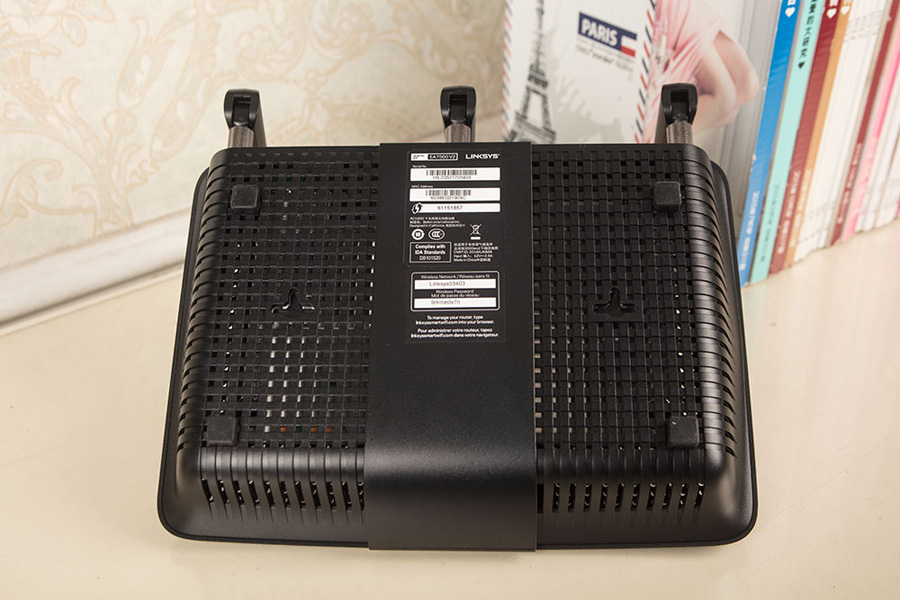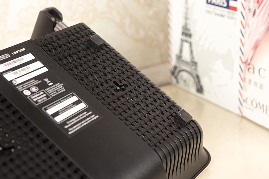底部使用增高型腳墊,抬高EA7500 V2于桌面之間的空間,更利于散熱,此外設計有T型掛孔支持壁掛。