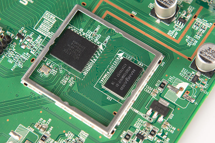 SOC采用MediaTek MT7621A,使用MIPS® 1004KEc? 雙核心中心處理器 (CPU)主頻880 MHz,內置5個千兆交換,支持一個USB3.0、一個USB2.0及3個PCIe1.1通道,支持NAT和QOS硬件加速。