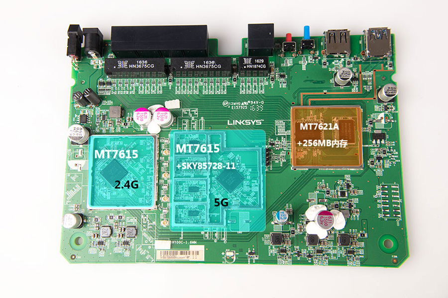 在方案設計上EA7500 V2采用了MT7621A+雙MT7615。雙核800MHZ主頻,搭載256MB內存,有著不錯的性能,難能可貴的是采用了雙TM7621,2.4G和5G各一顆,分別內置協處理器負責網絡數據處理,這也就意味著EA7500 V2在使用WIFI時不占用CPU,從而大大提高了多用戶無線接入后的高性能及穩定性。
