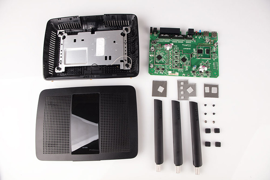 打開之后發現EA7500 V2采用的是3+1天線設計,除了3條要拆分的全向天線之外,在路由內部還隱藏一條平板天線。