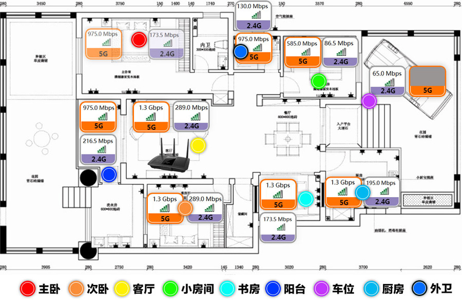 從無線覆蓋來看138平的房子基本都可以覆蓋到。由于5G使用了獨立的功率放大器強化信號,因此可以看到在穿一墻的情況下無線速度明顯優于2.4G,像只有一墻之隔的主臥、次臥、書房都有很好的表現,就連距離比較遠穿墻比較多的小房間也比2.4G快。當然5G雖然經過信號的強化但每穿一墻之后信號的衰減也比較大,像后園的停車位5G已經時有時無連接不上了,不過2.4G還是可以用。