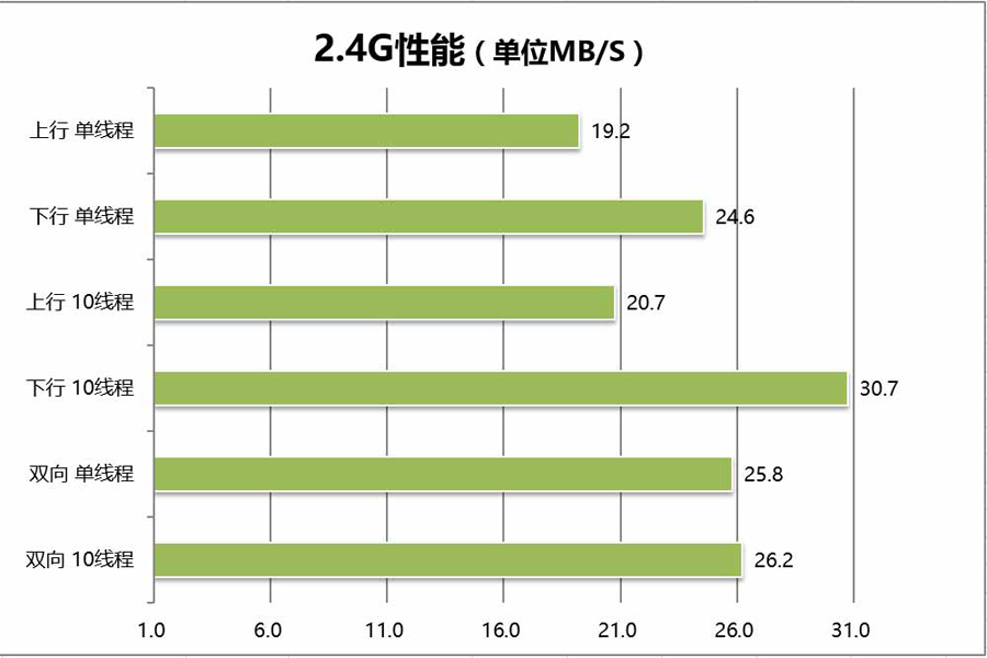 因為家里環境復雜,信號受到身邊鄰居無線的影響,而受國標規定又不能開40MHZ因此在29MHZ下測試,也可以說是最貼近絕大多數人正常使用的環境。實測情況如上,2.4G在19.2-30MB/S之間,中規中矩。