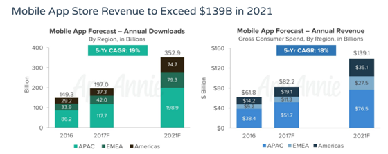 App Annie預測,到2021年全球移動應用下載量將超過3520億,所有應用商店的消費支出總額將超過1390億美元。而iOS App Store將占據這一收入的大部分,預計將達到600億美元,而Google Play則預計為420億美元,第三方商店則很有可能達到360億美元。