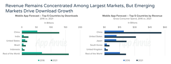 據數據顯示,下載量排名前五的中國、印度、美國、巴西和印尼的應用下載量占到了全球下載總量的54%,然而營收方面卻是中國、美國、日本、韓國、英國等高收入國家占到了75%,預計這一占比還將在2021年增長到85%。
