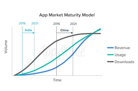 這份報告還預計,中國的下載量將從2016年到2021年以19%的速度增長,而消費支出將增長24%,達到565億美元。在較大城市,中國大部分智能手機市場已經飽和,這意味著“量”的增長點將很有可能在全球其余地區產生,印度就是其中之一。