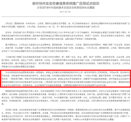 日前,國家郵政局已發(fā)文稱,將于4月起,在全國31個省份開始試點實名收寄信息系統(tǒng)推廣工作。文件中提到兩個關(guān)鍵點:一是實名收寄制,二是用戶身份信息數(shù)字化。