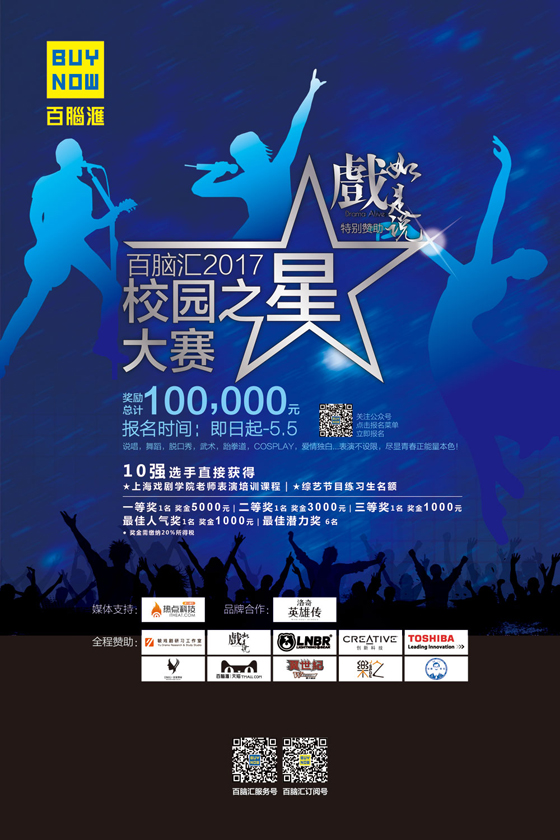 由全新升級轉型的科技智能廣場「百腦匯上海店」與上海戲劇學院 “毓” 戲劇研習工作室《戲如是說》節目組攜手聯合打造的2017上海百腦匯“校園之星”大賽暨翼世紀杯“守望先鋒”校園電競大賽于4月18日激情起航,深入高校海選招募,選手層層晉級后,將于百腦匯上海店進行總決賽,爭奪總價值超10萬的大獎,展現大學生的青春活力面貌,發掘明日“校園之星”!