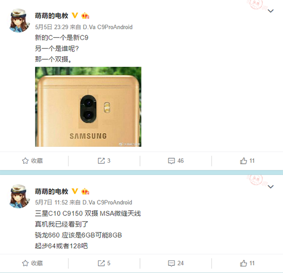 李穎坤 / 2017-05-08 11:46172428此前已有消息稱三星正在研發雙攝像頭的方案,甚至在S8發布前曝光了一些搭載雙攝像頭的S8工程機,種種證據都表明三星用上雙攝像頭是遲早的事,但為什么沒有在S8上使用或許是出于對成像畫質以及雙攝玩法上的考慮。而就在大家都以為三星將在年底發布的Galaxy Note8上使用雙攝像頭的時候,微博網友@萌萌的電教 卻向大家曝光了關于三星中國中端特供機——C10的一些信息,而其中最大的亮點便是雙攝像頭了,但并不清楚其具體的雙攝方案。