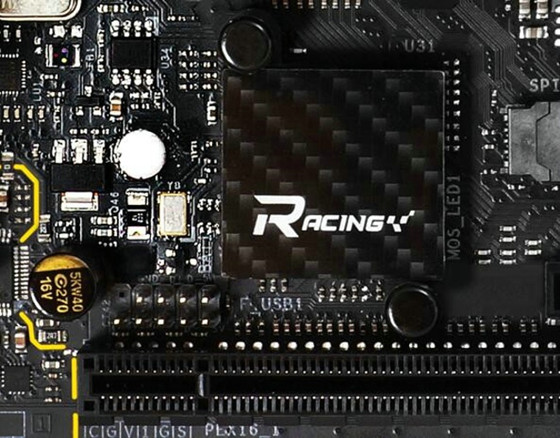 主板的顏值依舊高大上,碳纖維散熱模組十分給力,印有RACING LOGO這塊碳纖維散熱片顏值更得到了提升,內建了一組RGB LED,主板點亮之后更加酷炫。