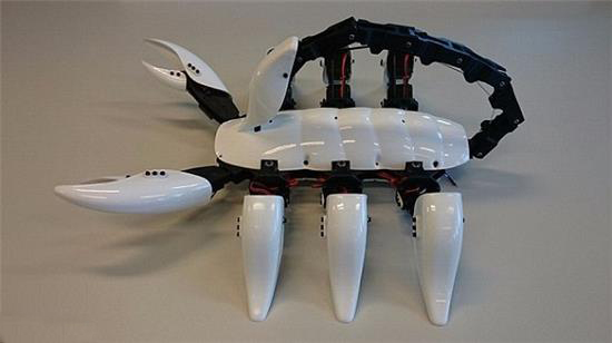 和真的蝎子一樣,學(xué)生所設(shè)計(jì)的這個(gè)白色的六足蝎子機(jī)器人也有兩個(gè)螯、一個(gè)尾巴和身體,不同之處在于這只蝎子機(jī)器人只有6個(gè)腳。它不僅可以全方位走動(dòng)還可以感應(yīng)周圍環(huán)境,在攻擊者手上留下記號(hào)。