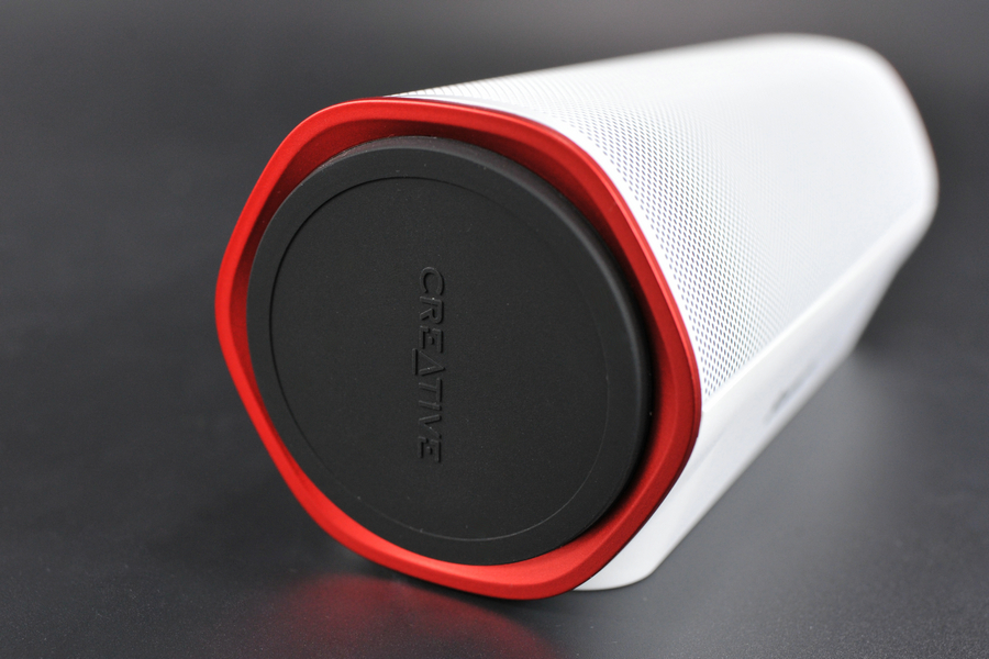 FRee的機身外觀大多采用了磨砂質感的外殼,兩處“Sound Blaster ”logo也十分顯眼,其中一處也設有橫臥的橡膠支腳,以便安放。兩側則是橡膠材質,一側為電源鍵、音量鍵和藍牙(通話接聽)按鍵而在電源鍵以及藍牙鍵都附有提示燈以便提示電源情況以及藍牙連接情況,一側則僅有創新logo(可直立放置,采用橡膠材質應該是增加摩擦力)。