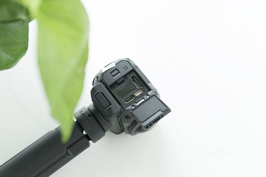 VIRB 360的頂部擁有一塊黑白顯示器,下方則是三顆按鍵,兩側分別是一鍵錄制按鈕和接口區域(mini HDMI接口、MicroSD卡插槽,MicroUSB接口),這也意味著它完全可以獨立使用,進行拍攝和錄制沒有任何問題。如此精巧的機身,集合了兩顆廣角度達到200度的攝像頭、豐富的接口和按鈕、電池倉、兩顆指示燈 、四個麥克風以及超多運動傳感器,集成度非常高,可以說是將機身的每一面都完全利用上了,絲毫沒有浪費一方一平。