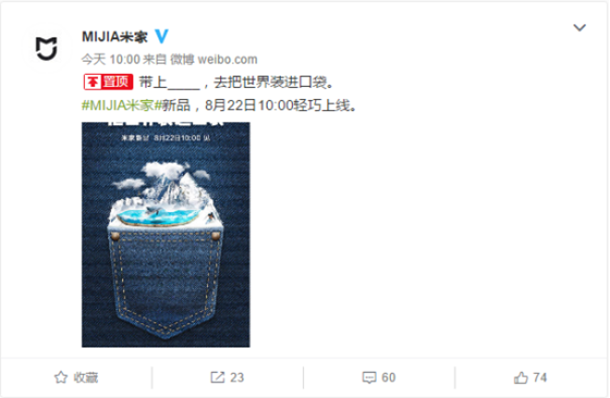8月21日上午十點,@MIJIA米家官方微博發(fā)布一條新的微博,表示明天上午十點會發(fā)布一款米家新品,帶上它,可以把世界裝進口袋。新品十分輕巧。