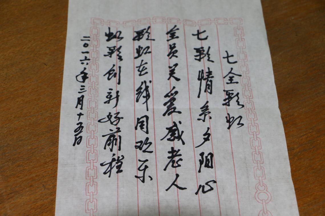 老人為愛心人員送上致謝信:“讓我怎樣感謝你,當我走向你的時候。我原想收獲一縷春風,彩虹卻給了我整個春天。讓我怎樣感謝你,當我走向你的時候,我原想捧起一片浪花,七彩虹卻給了我整片海洋。讓我怎樣感謝你,當我走向你的時候,我原想擷取一枚紅葉,七彩虹卻給了我整個楓林。讓我怎樣感謝你,當我走向你的時候,我原想親吻一片雪花,七彩虹卻給了我彩虹世界。”
