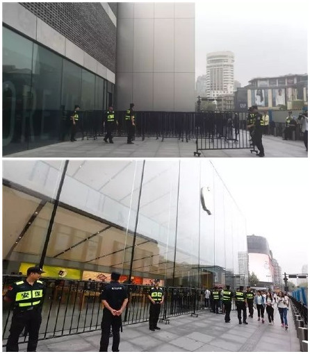 蘋果西湖店門口黑壓壓的一片排隊護欄也被默默拆去,數量眾多的安保人員陣勢驚人。