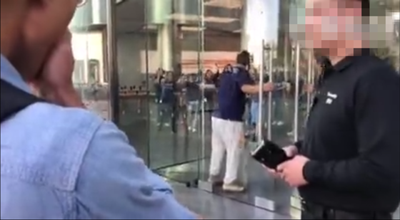北京王府井店四位排隊的客戶也是在眾多店員的簇擁之中走進店內。