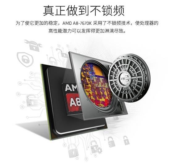 此外,AMD A8-7670K依然是黑盒帶K不鎖倍頻設計,開放超頻使處理器的最高性能潛力可以得到進一步全面發揮。其他方面,A8-7670K支持DDR3-2133高頻內存,熱設計功耗依然保持在95W。在接口上,A8-7670K可與配備有Socket FM2+接口的主板兼容使用,例如A88X、A78、A75等等,無論您是升級還是新裝機都不用擔心兼容性問題。