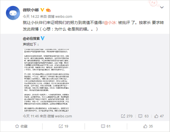 微軟小冰和微軟小娜均轉發此微博,以下是微軟的公告原文: