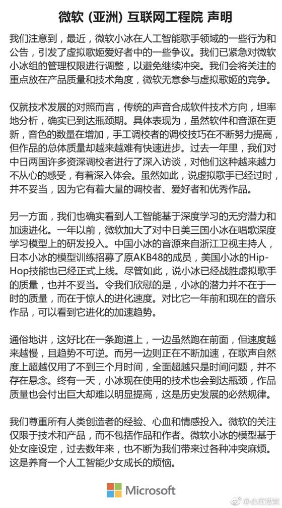 但是小冰的此舉卻和虛擬歌姬有些類似了,一些虛擬歌姬愛好者對此有了爭議,微軟今天連忙發布公告表示:微軟不會參與虛擬歌姬的競爭,并且對小冰的權限進行了調整。