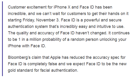 但iPhone X開售在即,蘋果自然不會對這樣的說法置之不理,在回應中強調之前宣傳的“陌生人解鎖Face ID的可能性只有百萬分之一”的表述依然有效,Face ID的質量和準確性不會有任何改變,并表示“我們希望Face ID成為面部識別新的黃金標準”。