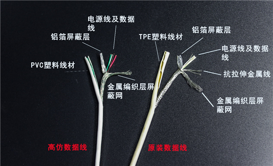 市場上還有最大一部分的未認證數據線只是在PVC或者TPE塑料線材下面簡單地包裹一層信號屏蔽層,還有的山寨產品甚至沒有。這種數據線占據未認證數據線中絕大部分,單層信號屏蔽層有可能會受到外界電磁場干擾,導致數據傳輸錯誤,假設將設備數據傳輸到電腦上的時候,數據受到外界電磁場干擾發生錯誤,電腦識別此文件是錯誤文件,會返回數據,然后設備會再一次進行傳輸,這樣就放慢了傳輸速率。
