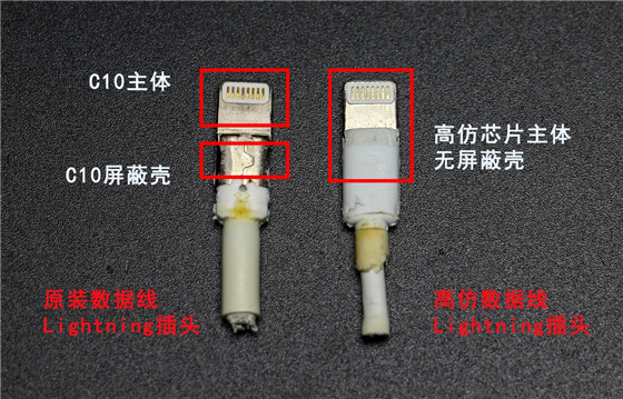 屏蔽殼可以起到保護Lightning插頭的作用,同時可以讓Lightning插頭在插入設備后承受垂直向下100N(約10公斤)壓力,當然這也有抗拉伸金屬線功勞。而圖中高仿的Lightning插頭數據線只有注塑的一層橡膠隔離開來。