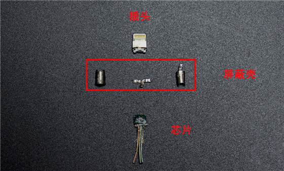 不得不說蘋果原裝的Lightning插頭太難拆解,,由于屏蔽殼上面焊接了一個直徑為0.3毫米的焊接點,別小看這0.3毫米,筆者拆解不開。最后只能暴力拆解。