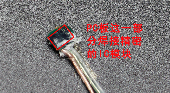 原裝數據線的的PC板上焊接有密集的模塊,表面用透明膠體包裹,嚴密性以及安全性極高,筆者相信C10芯片的Lightning插頭即使浸入水中也是絲毫沒有問題的。這些PC板上的模塊包括邏輯模塊,電源模塊,專門的認證芯片等等。