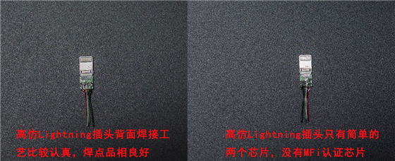 高仿Lightning插頭沒有MFi認證芯片,無法提供蘋果設置的充電解決方案,但是焊接品相良好。