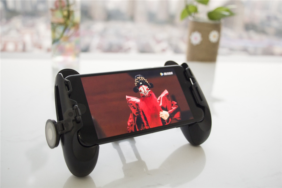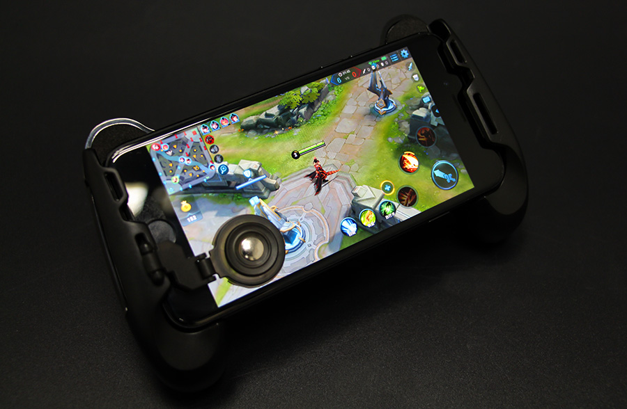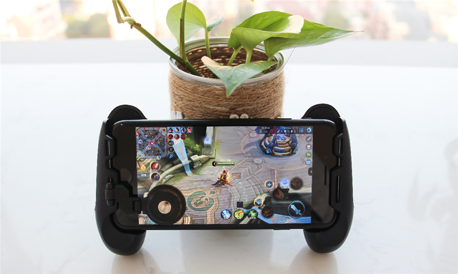 將手機iPhone 7夾入手柄中,進行王者榮耀游戲。