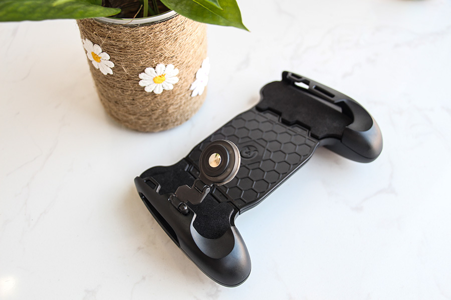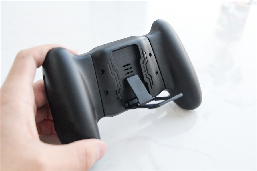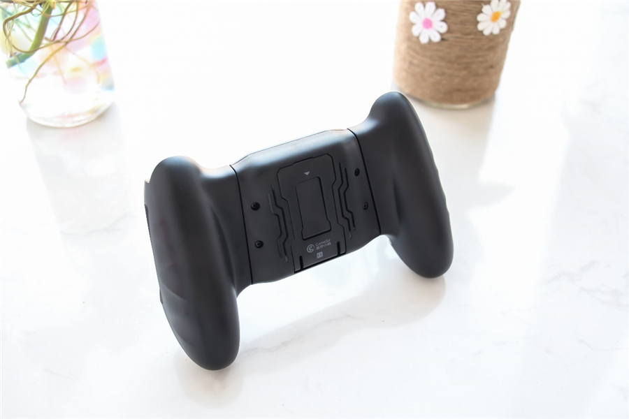 小雞手柄F1外觀為手柄樣式,與索尼PlayStation手柄造型類似,F1在中間留出一個卡槽,采用可拉伸設計,可以將手柄拉開夾住手機。