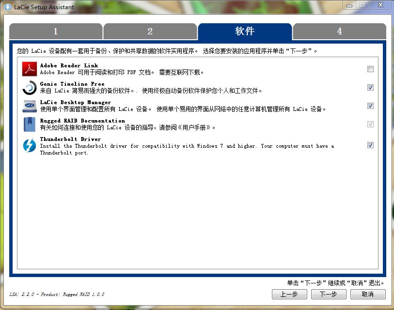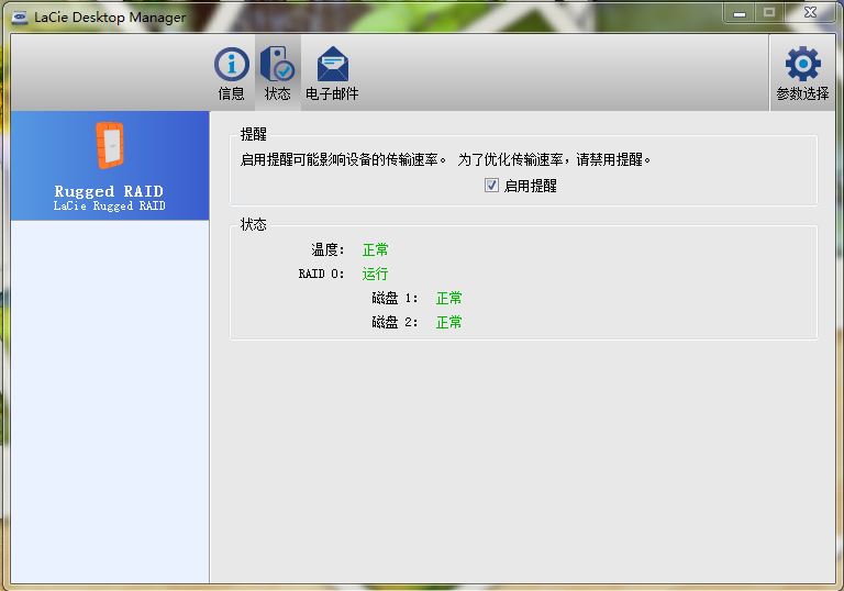 LaCie Rugged RAID作為定位于高端的存儲(chǔ)產(chǎn)品,LaCie還為其配置了軟件,在第一次使用的時(shí)候需要安裝,小編是在Windows平臺(tái)安裝了此驅(qū)動(dòng)器。該軟件主要可以查看硬盤(pán)的事實(shí)狀態(tài),如提醒是否溫度過(guò)高、工作是否正常等。