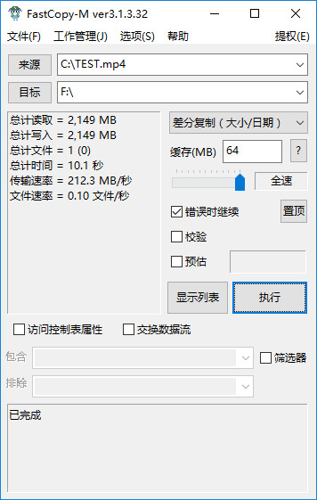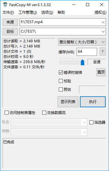 我們采用FastCopy來(lái)模擬真實(shí)讀寫(xiě)操作,測(cè)試存儲(chǔ)設(shè)備的真實(shí)讀寫(xiě)速度。通過(guò)對(duì)2G文件進(jìn)行復(fù)制寫(xiě)入速度212.3MB/s,用時(shí)10.1秒。而從移動(dòng)硬盤(pán)讀取出文件的速度為239.6MB/s,綜合讀寫(xiě)速度相當(dāng)迅速,屬于理想水平。