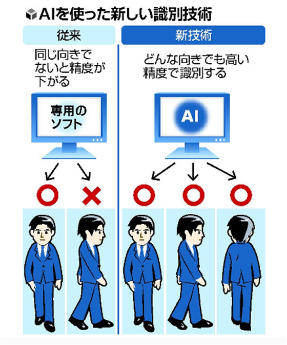 日本研究小組表示通過將視頻中人類的走路姿勢、步幅、重心、手的擺動方式等進行量化,然后利用人工智能自動學習的功能,通過警方確認監控中拍攝的嫌疑人身份視頻數據庫進行學習,大大提高視頻識別走路姿勢的精確度,目前他們讓人工智能學習了約一萬人以各種方向走路的視頻。而他們表示這個技術很有希望應用到犯罪偵查中。