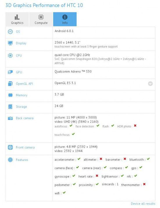 現(xiàn)在,關(guān)于HTC M10的完整配置已經(jīng)出現(xiàn)在GFXbench中,數(shù)據(jù)顯示,HTC M10的屏幕大小為5.1英寸,2K的分辨率,搭載高通驍龍820處理器,GPU則是高通的Adreno 530,4GB的運(yùn)存和32GB的內(nèi)存。前置500萬,后置1200萬像素的攝像頭,同時(shí)支持4K視頻拍攝。