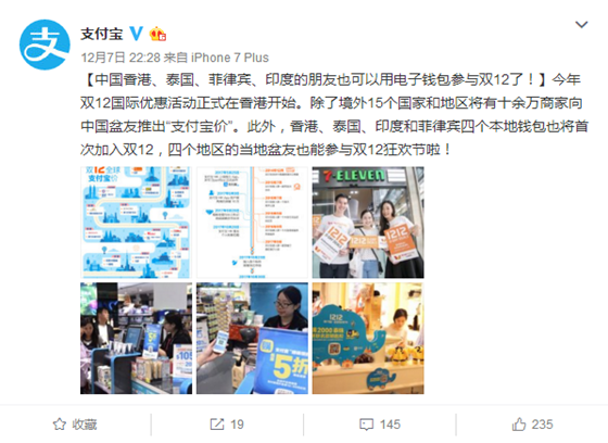 17日晚間,支付寶官微宣布,“今年雙12國際優惠活動正式在香港開始。除了境外15個國家和地區將有十余萬商家向中國盆友推出“支付寶價”。此外,香港、泰國、印度和菲律賓四個本地錢包也將首次加入雙12,四個地區的當地盆友也能參與雙12狂歡節啦!”