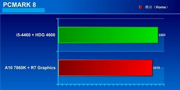 測(cè)試小結(jié): 常用軟件測(cè)試中使用了PCMark 8的Home項(xiàng)目測(cè)試,Home項(xiàng)目模擬人們?cè)诩抑惺褂秒娔X的各種習(xí)慣來(lái)進(jìn)行的虛擬測(cè)試,其中包含了“網(wǎng)頁(yè)瀏覽、文檔創(chuàng)建、游戲體驗(yàn)、照片編輯和視頻聊天 室”這五個(gè)不同的子項(xiàng)目。憑借著最高4.0GHz的主頻,A10-7860K與i5-4460的差距非常小,實(shí)際使用感受難以察覺(jué)到像理論性能的差距。