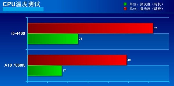 測(cè)試小結(jié):功耗測(cè)試中,由于優(yōu)化了CPU功耗,AMD一改以往功耗高的形象,65W的A10-7860K的表現(xiàn)的更出色。溫度測(cè)試更是一邊倒的情況,一方面得益于,AMD的功耗優(yōu)化,另一方面,全新的S2.0散熱器明顯性能要高于Intel原裝的散熱器。