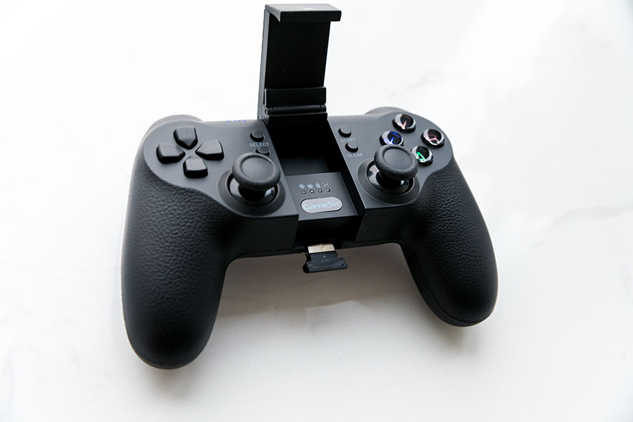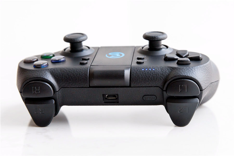 和別的手游手柄的開啟稍有不同,手柄上沒有開關標記按鈕,而且通過長按頂部的Home鍵進行開關操作。頂部的中間為usb的接口,手柄在開啟前右邊的ABXY四個圓形按鈕鍵都為灰色,開啟后左上角的四個燈會亮起,ABXY的按鍵都會顯示各自不同的色彩,分外好看。頂部的L1L2與R1R2鍵也完全和PS的手柄一樣的命名和位置,真不愧是索尼同款線性扳機鍵