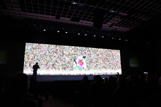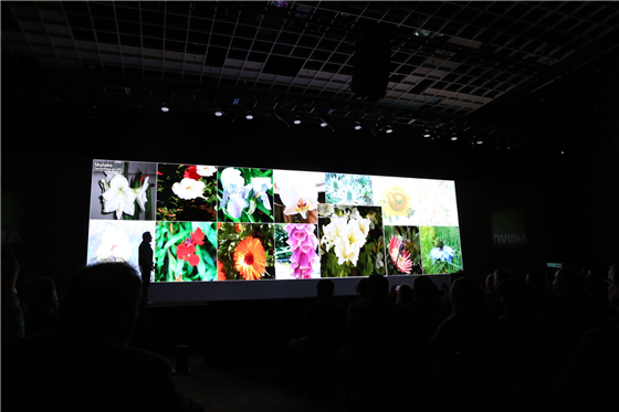 不光是自動駕駛方面,黃仁勛還介紹了Volta架構處理器,搭載著運算速度達到125 TFLOPS(每秒萬億次浮點運算)的tensor core,用于處理AI工作負載,在會上,黃仁勛還給大家演示了AI的神奇之處,比如8個Tesla V100芯片每秒可以識別7012張圖片,生成不存在的人臉,應景而作的歌曲等。