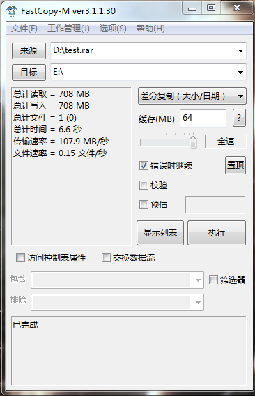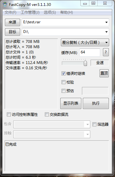 我們采用FastCopy來模擬真實讀寫操作,測試存儲設備的真實讀寫速度。通過對708M文件進行復制寫入速度107.9MB/s,用時6.6秒。而從移動硬盤讀取出文件的速度為112.4MB/s,綜合讀寫速度比較一般。