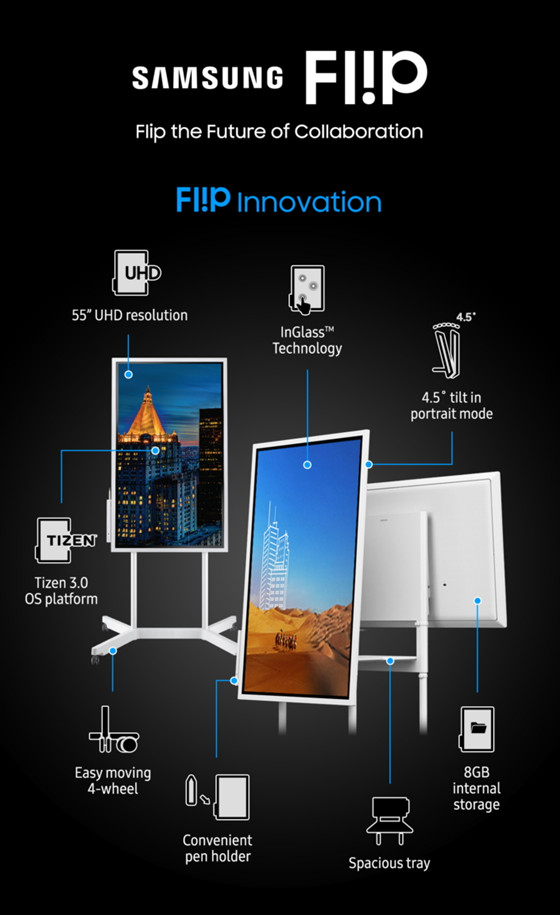 Flip擁有55英寸超高清顯示器,搭載Tizen 3.0 OS平臺,內置5GB存儲空間,