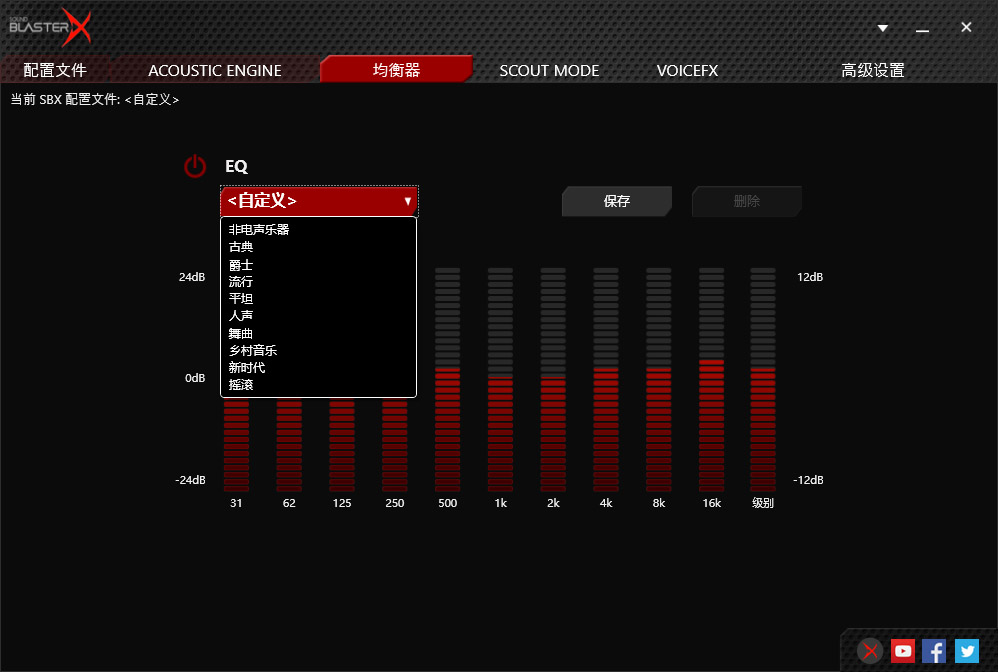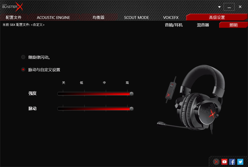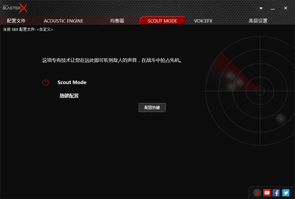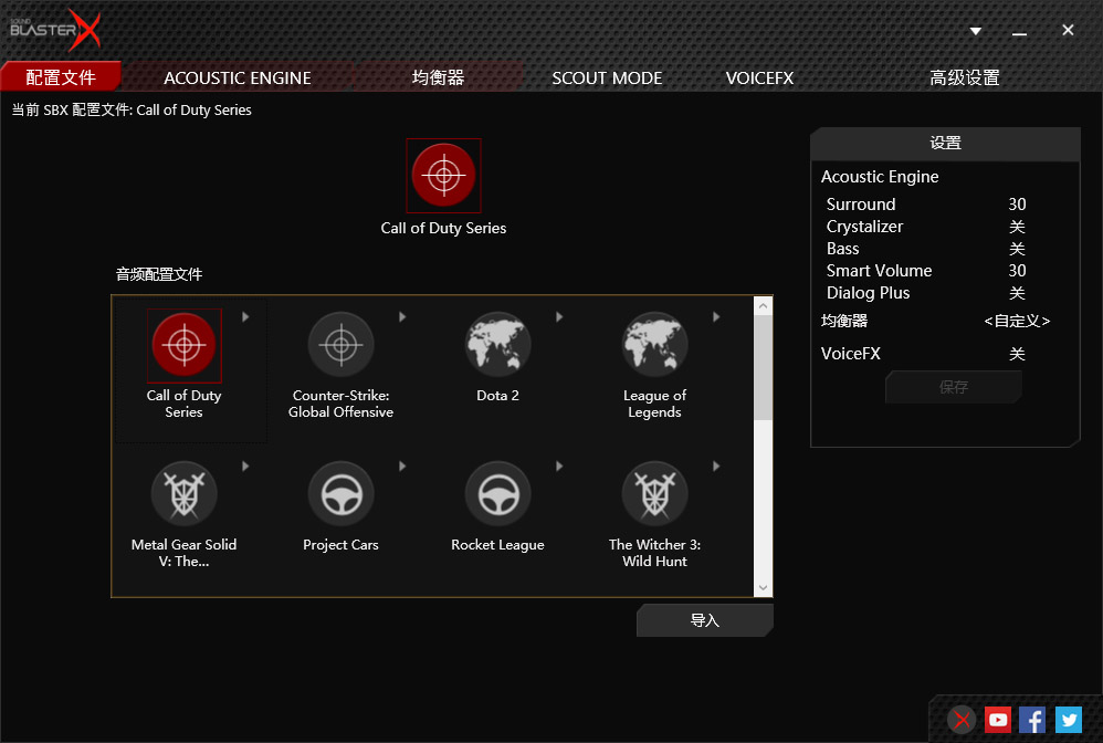 接著我們來介紹一下這款耳機的驅動程序—BlasterX Acoustic Engine Pro,和SBX不同,BlasterX Acoustic Engine Pro更注重游戲方面的優化,其預設了大量游戲的音效配置。下面我們就來介紹一下這款全新的驅動程序。