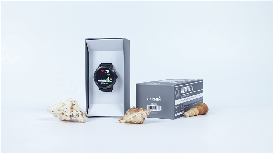 Garmin vívoactive 3的外包裝主色調(diào)為銀灰+白,主打科技運(yùn)動(dòng)風(fēng)。