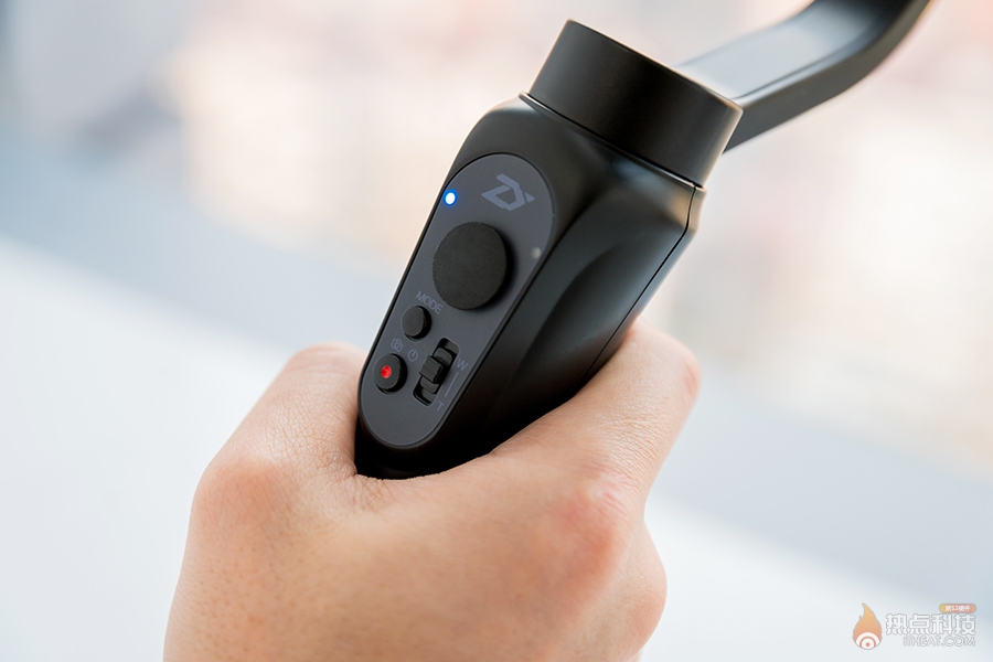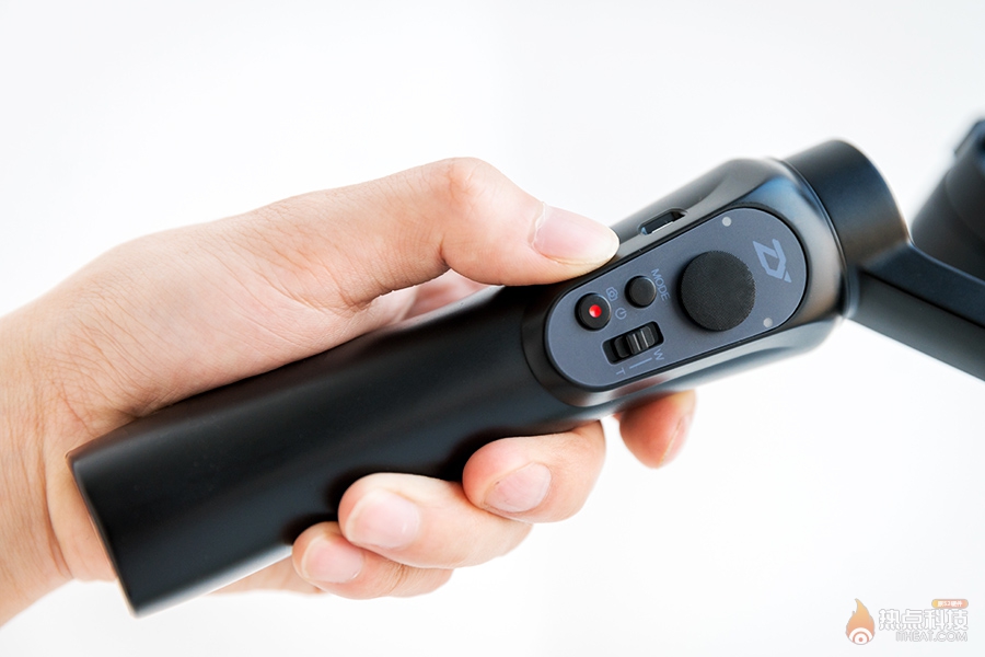 Smooth Q整體上采用了塑料磨砂材質,握持的手感還是很不錯的。450g的重量握在手里顯得非常的輕盈小巧,云臺的正面為智云的搖桿鍵,MODE模式鍵,變焦撥桿以及拍攝和開關按鈕集成的一個按鍵。左右兩側各有一個指示燈,左邊為電量指示燈,右邊為狀態指示燈。