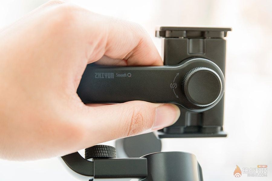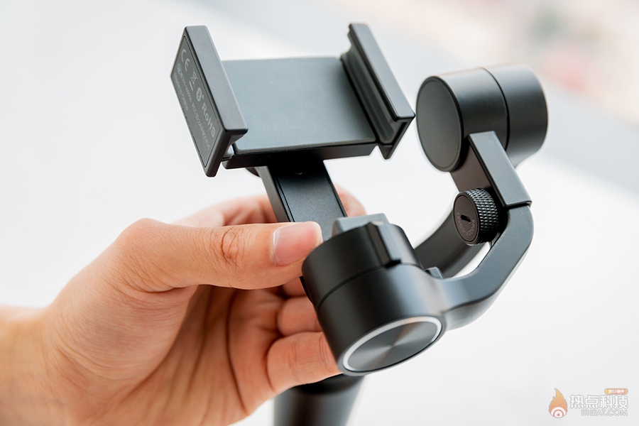 穩定器的上方為手機支架和機軸,6.5寸以下的手機都能裝入支架,手機的支架有點緊,需要用力才能拉伸放入手機,不過想必也是為了手機的安全穩固,并且有Y軸調旋按鈕和手機夾旋鈕可供用戶調節,Y軸調旋按鈕調節手機支架的高度,手機夾旋鈕調節手機橫拍和豎拍的切換功能。