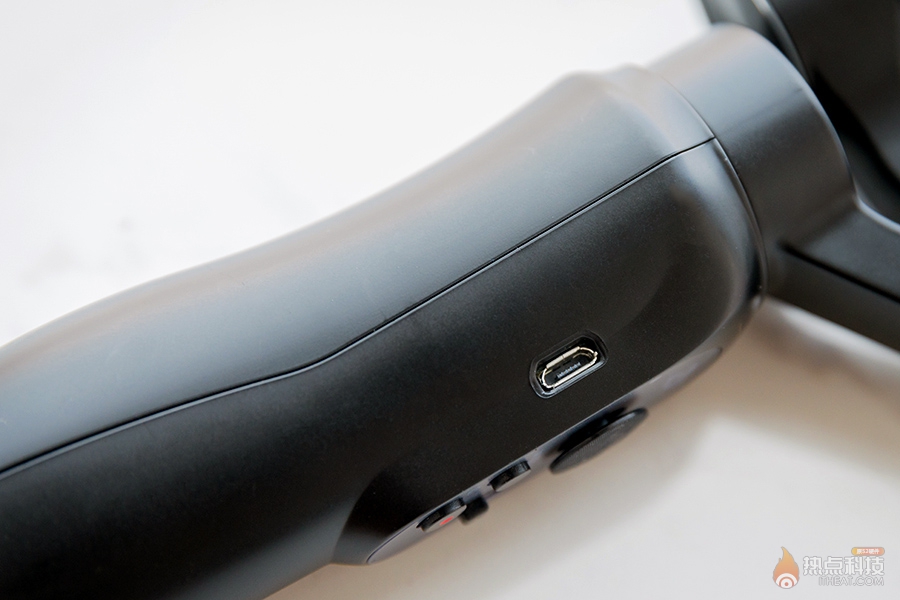 云臺的左側為充電接口,當處于充電狀態時,云臺正面的狀態指示燈為黃色燈光閃爍狀態,而當電量充滿后,狀態指示燈變為黃色燈光常亮狀態。穩定器底部有一個USB接口,支持2V5A電源輸出,內置了兩塊18650鋰電池,可以給手機補充電量,充當一個移動電源的功能。