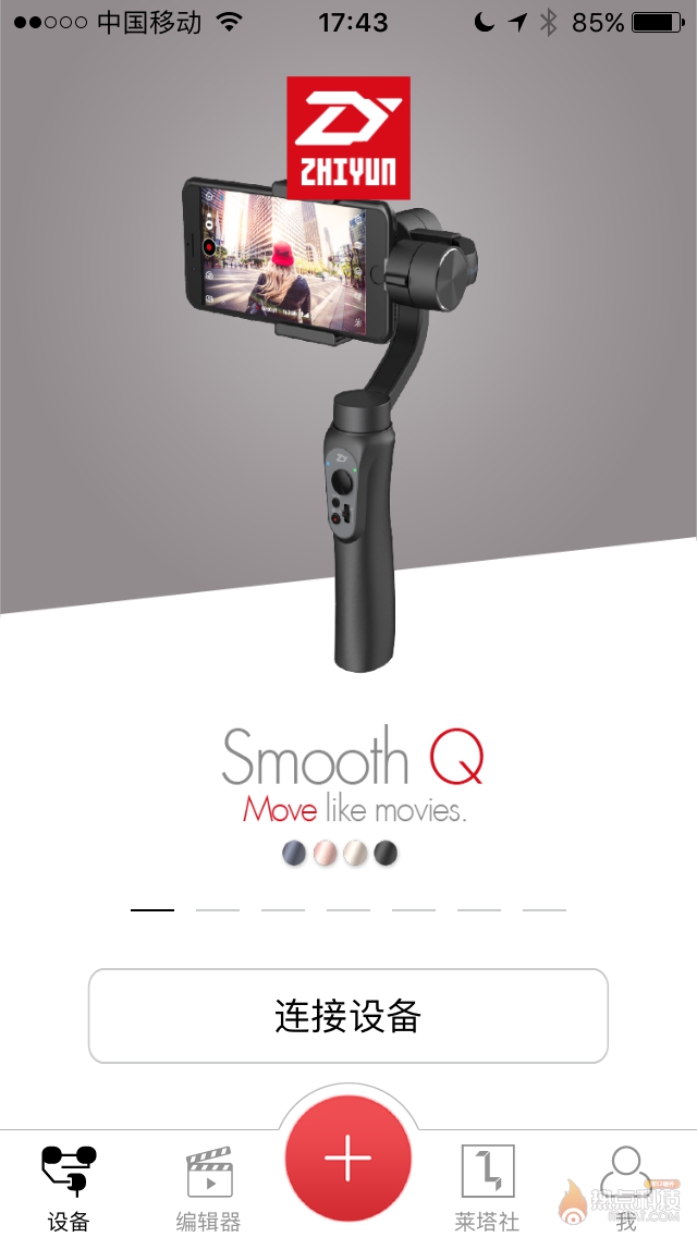 手機裝上Smooth Q的云臺支架后,長按開關鍵打開穩定器,打開手機藍牙連接穩定器,安裝智云的App應用ZY Play就可以開始使用了,ZY Play目前最新的IOS系統版本為2.3.9,安卓系統版本為1.8.8,云臺打開時默認是左右跟隨模式。該模式下俯仰軸和橫滾軸被鎖定,水平方位的調整根據手柄的轉動而發生變化,俯仰的角度通過向上或向下推動搖桿來控制。